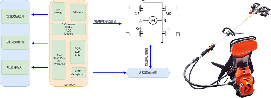 本方案采用PL51T020芯片,芯片內(nèi)集成4KB-flash,128Byte真EEPROM,11Bit-ADC, 4路PWM等豐富資源。系統(tǒng)利用PL51T020偏上集成諸多資源,實(shí)現(xiàn)剪刀機(jī)開關(guān)信號(hào),位置信號(hào)等檢測(cè),電機(jī)過載異常檢測(cè);電路簡(jiǎn)潔成本可控。