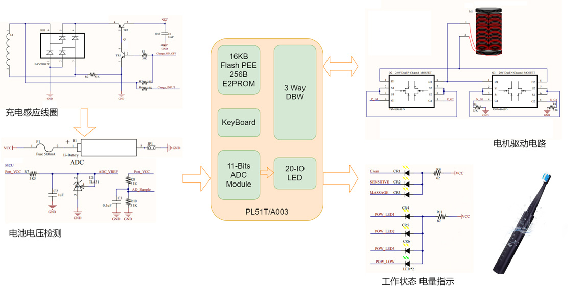 本方案采用PL51T/A003芯片,芯片內(nèi)集成16KB-flash,256Byte真EEPROM,11Bit-ADC, 3路DBW等豐富資源; 方案集成無線線圈感應(yīng)式充電,過沖保護(hù),過放保護(hù),LED電量指示功能; PWM驅(qū)動(dòng)集成DBW死區(qū)保護(hù)功能,有效保護(hù)驅(qū)動(dòng)MOS;