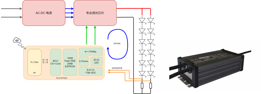 本方案采用PL51WT003芯片,芯片內(nèi)集成16KB-flash,256Byte真EEPROM,8+8路11Bit-ADC, 6路PWM等豐富資源,同時(shí)片上集成了PL1166A射頻芯片,實(shí)現(xiàn)無線遙控等功能; 方案實(shí)時(shí)采集各路燈珠的電流,做到燈珠電流閉環(huán)精準(zhǔn)控制, 能夠有效避免燈珠長(zhǎng)時(shí)間使用造成的亮度降低問題;